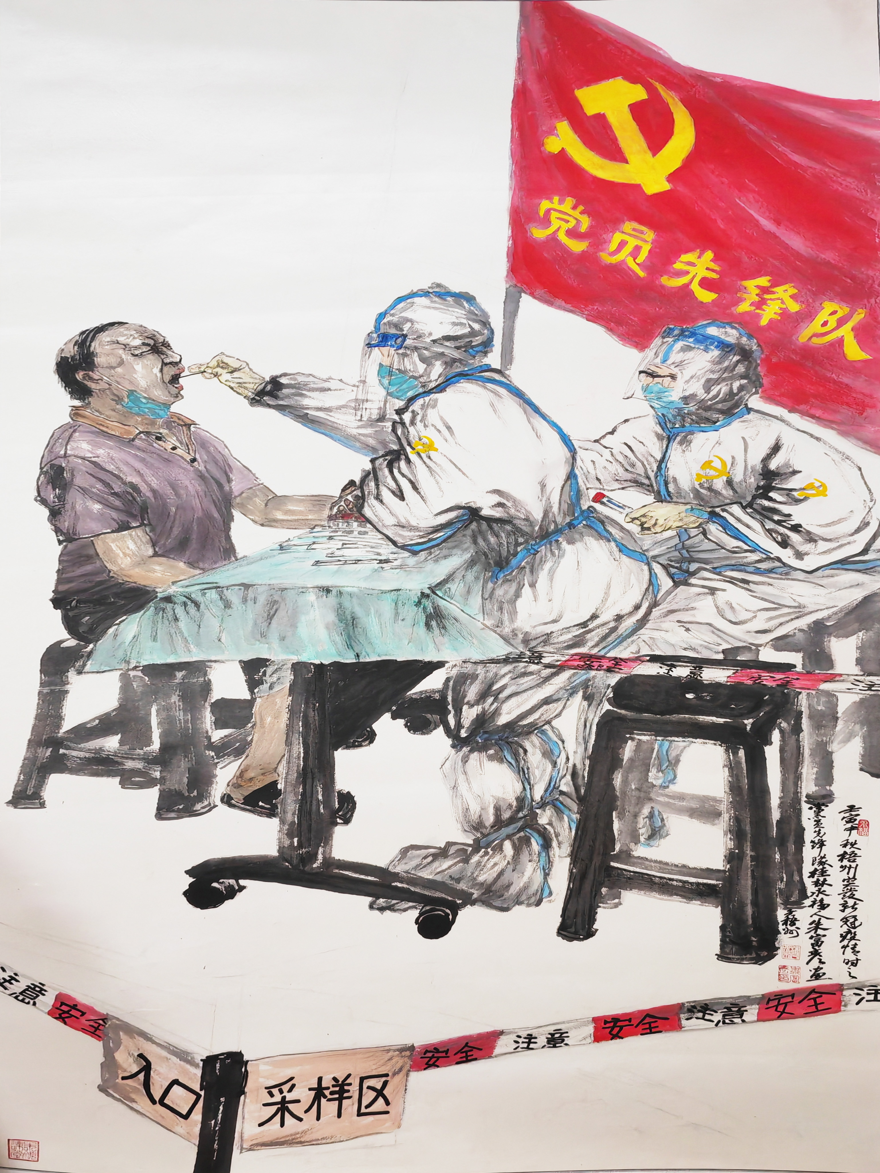 朱富彦 国画《梧城抗疫之党员先锋队》97x180cm