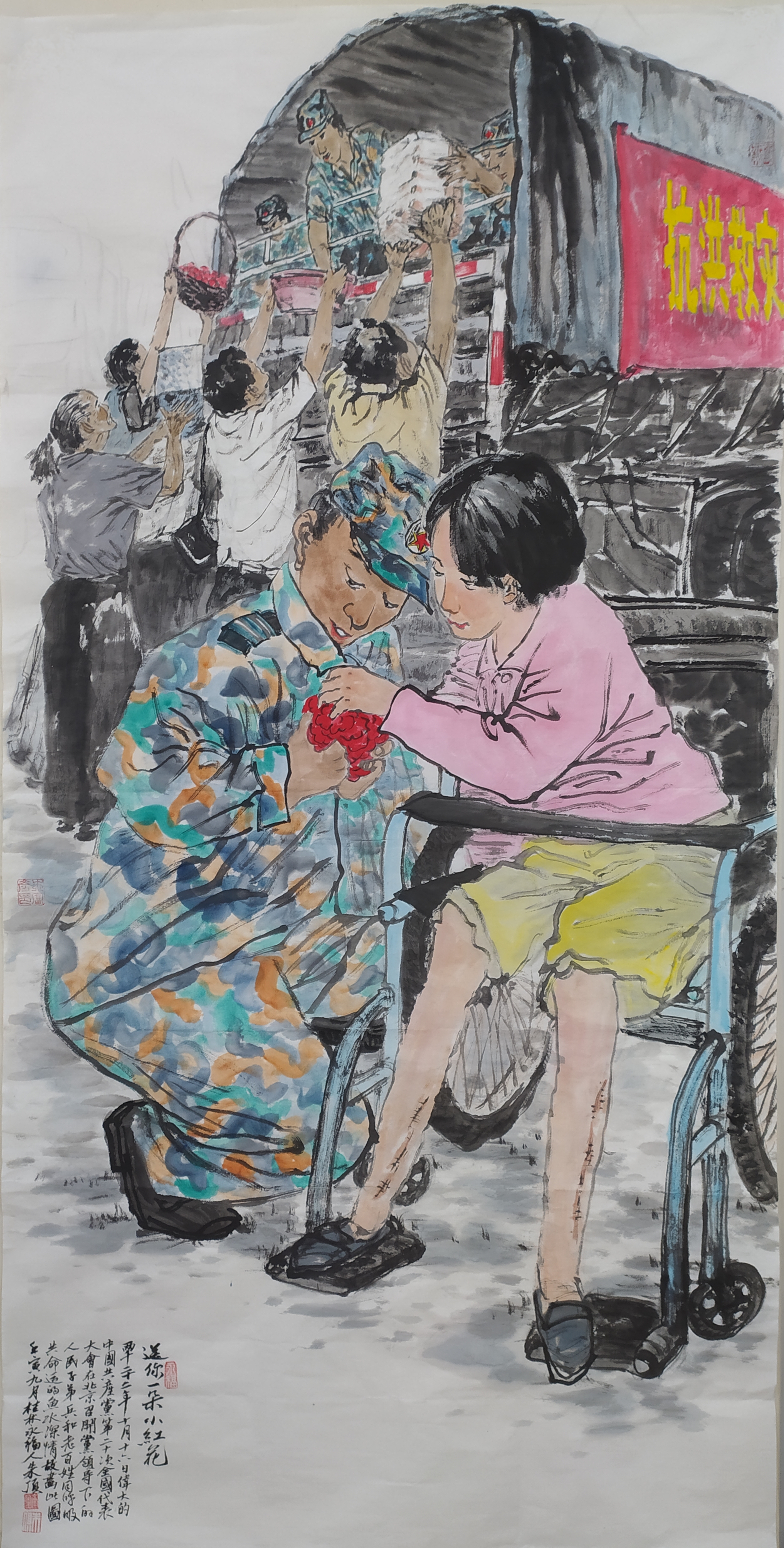 朱富彦 《军民鱼水情之送你一朵小红花》 宣纸设色68cmX136cm
