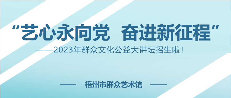 为广泛开展普及性公益艺术文化辅导活动,提高我市艺术爱好者及市民群众的艺术素养,更好推动我市群众文化工作高质量发展,梧州市群众艺术馆将举办“艺心永向党 奋进新征程”——2023年群众文化公益大讲坛,此次培训也是梧州市“全心全艺 惠民学堂”——全民艺术普及公益培训活动之一,欢迎广大市民群众报名参加。